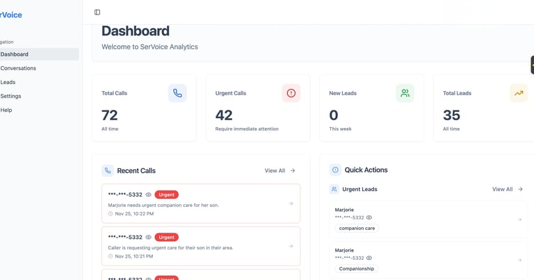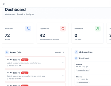 SerVoice helps home care agencies stay responsive 24/7 without overwhelming their teams. Calls are answered, urgent needs are prioritized, and every conversation is captured and summarized into clear intake documentation.